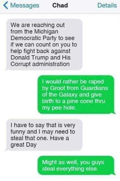 323 Conversation with a Dem outreach caller... (uploads.disquscdn.com) posted 164 days ago by FUSnowflake 164 days ago by FUSnowflake +323 / -0 7 comments share 7 comments share save hide report block hide child comments Comments (7) sorted by: top new old worst You're viewing a single comment thread. View all comments, or full comment thread. ▲ 1 ▼ – meme_cannon_operator 1 point 164 days ago +1 / -0 "It aint a pair of Nikes but whatever does it for you" permalink save report block reply