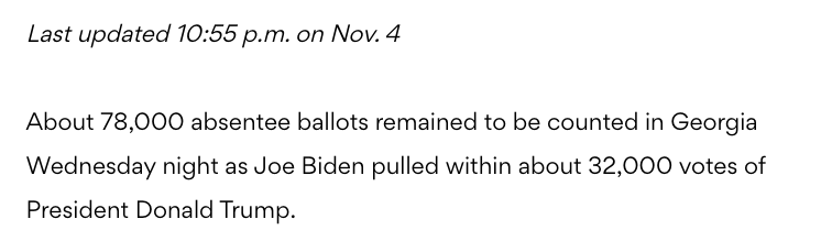 https://www.realclearpolitics.com/elections/live_results/2020/state/ga/president/ Up 23k with only 0.3% left to report