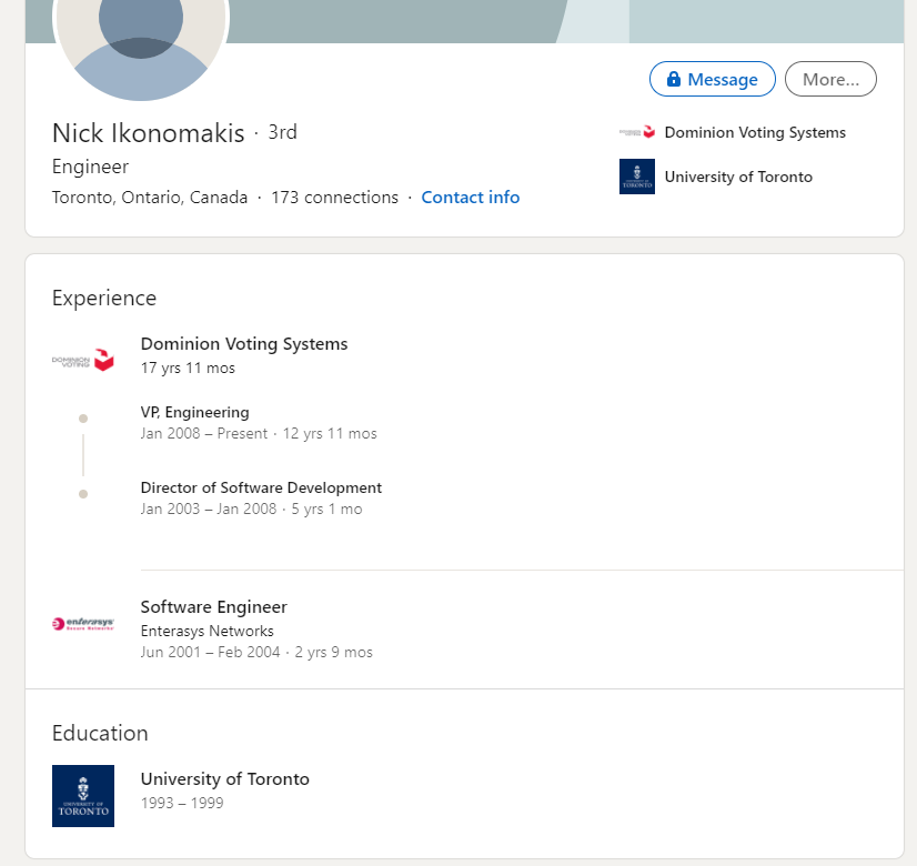 56 Why is a vice president for Dominion Voting Systems working in the field in a "battleground" state? Why is his information being wiped from the web? (media.patriots.win) posted 155 days ago by GEOTUSRocks 155 days ago by GEOTUSRocks +57 / -1 18 comments share 18 comments share save hide report block hide child comments Comments (18) sorted by: top new old worst You're viewing a single comment thread. View all comments, or full comment thread. ▲ 9 ▼ – Sully_Emerson 9 points 155 days ago +9 / -0 He's on linked in 3rd degree of separation from me. Yup works for them: https://i.postimg.cc/zvBV3gWf/123-Copy.png permalink save report block reply ▲ 3 ▼ – GEOTUSRocks [S] 3 points 152 days ago +3 / -0 Do you still have the screenshot you uploaded? The link above is dead now. permalink parent save report block reply ▲ 2 ▼ – Sully_Emerson 2 points 146 days ago +2 / -0 https://postimg.cc/MfjkWR3z permalink parent save report block reply