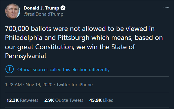Twitter marked it with "Official sources called this election differently". Since when are a few giant media corporations official sources? This is insane.