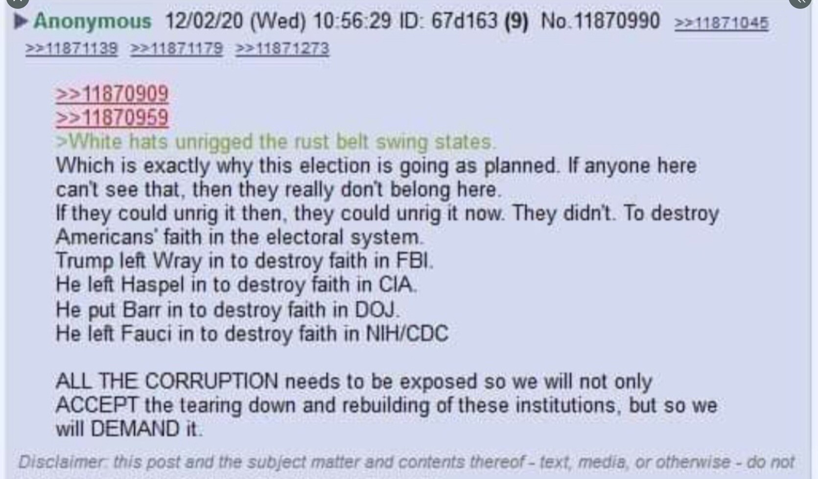It could be a possibility. Wray was hired late September 2017 to head the FBI. Haspel was hired May of 2018. During that time Trump was already setting up the EOs that were going to expose the 2020 Elections. Its not totally without merit that Trump may have expected to show how willfully inept these agencies are. Wray worked under Comey, and Trump knew Comey was dirty. So why would he put someone so close to Comey in charge of the FBI? Same thing with Gina Haspel. She was in charge of the CIA London bureau during the spying fiasco. He has already been briefed on the players by this time. Do you really believe he chose people like these if he was serious about bringing loyal people to these agencies. Barr I would say falls under your explanation. Same with people he surrounded himself like Mattis and Bolton. I believe he didn't believe these people were swamp, and found out the hard way. You're explanation is feasible for these people and maybe for Barr, but for Gina Hapel and Chris Wray, I'll tend to lean on the idea that he was setting them up.