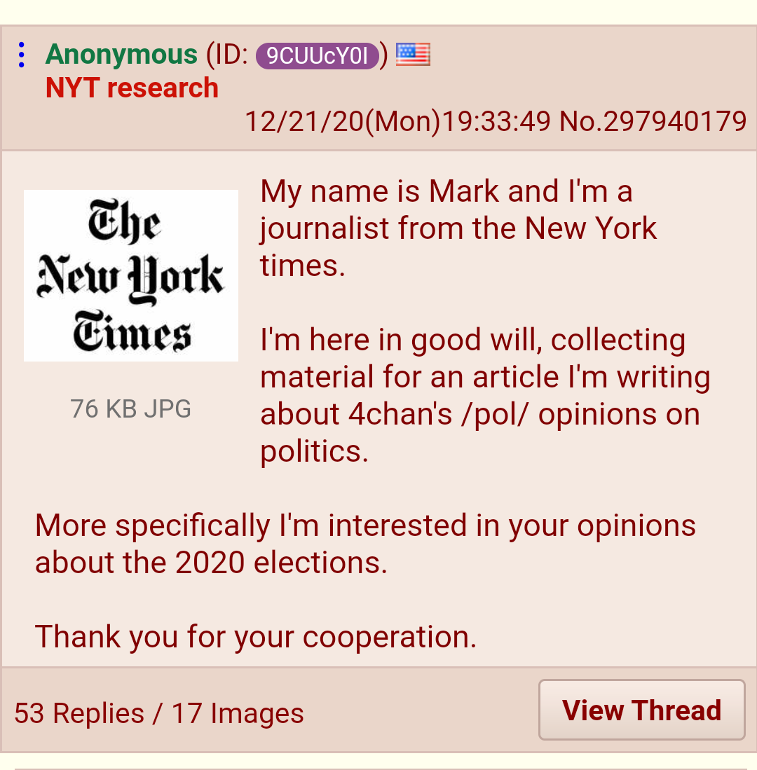 20 Be NYT propagandist, go on /pol and interoduce uourself as NYT “journalist”. Ask /pol what their opinion is on the 2020 election... /popcorn (gab.com) posted 116 days ago by cyber_acolyte 116 days ago by cyber_acolyte +20 / -0 21 comments share 21 comments share save hide report block hide child comments Comments (21) sorted by: top new old worst You're viewing a single comment thread. View all comments, or full comment thread. ▲ 3 ▼ – cyber_acolyte [S] 3 points 116 days ago +3 / -0 Link to thread. Sorry thought I posted it. https://boards.4chan.org/pol/thread/297940179 It’s early for me. Be gentle. permalink save report block reply