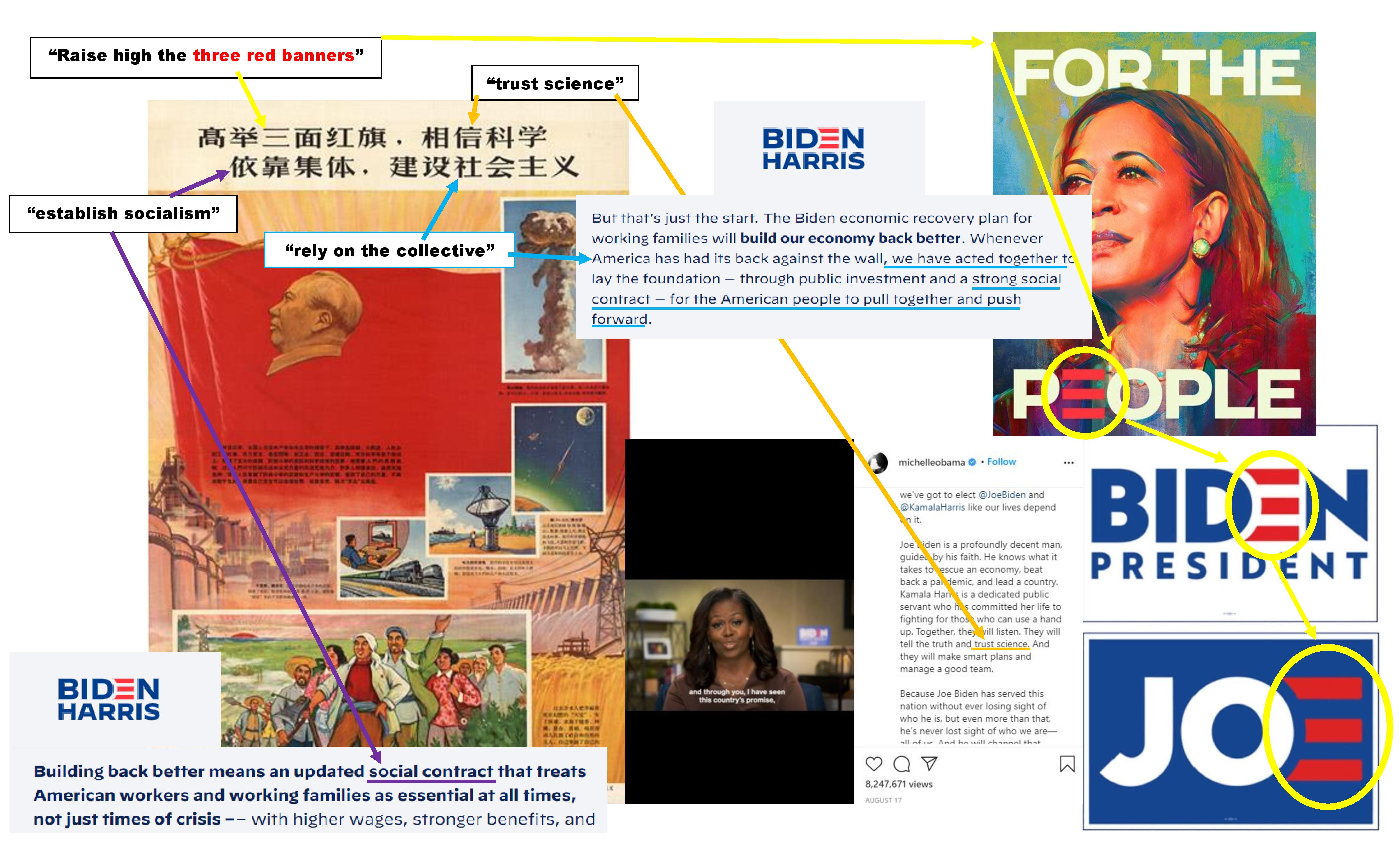 The first banner is an ideological slogan that calls on Chinese people to build a socialist state. The Great Leap Forward, initiated by Mao in 1958, aims to transfer China into an industrialized country. And the people’s communes put households together in rural areas where they shared everything from food to farm tools — a way to discount individuality and centralize more manpower and resources for agricultural and industrial production.