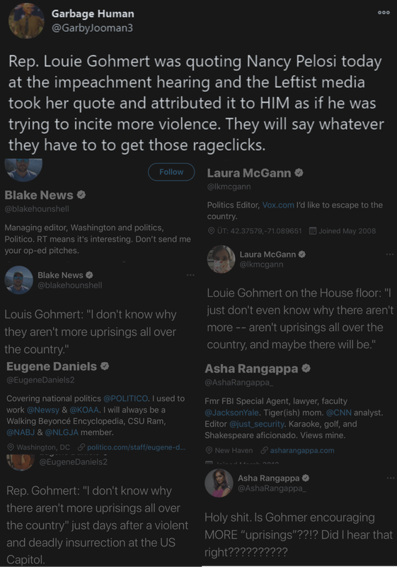 DUMBASS LIBS: Rep. Louie Gohmert was quoting Nancy Pelosi today at the impeachment hearing and the Leftist media took her quote and attributed it to HIM as if he was trying to incite more violence.