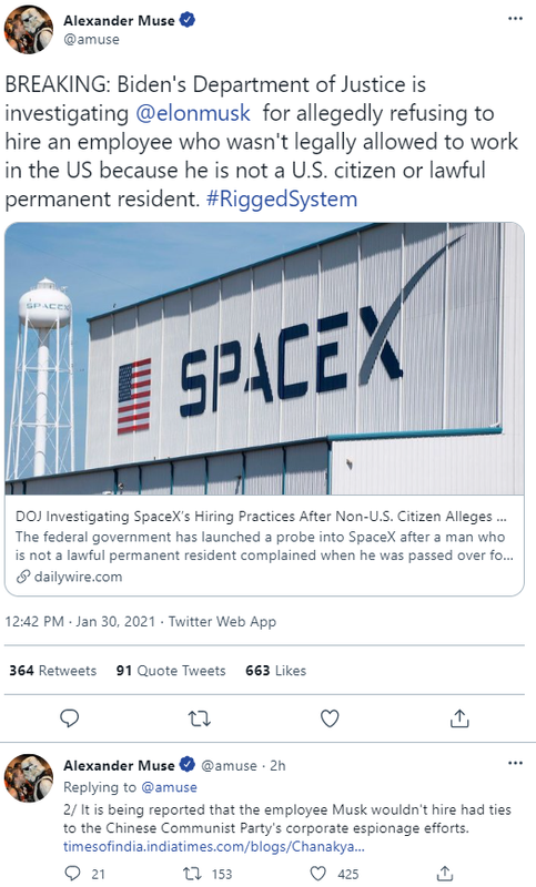 2988 WOW! The Department of Justice is investigating Elon Musk/SpaceX for NOT hiring a CCP agent!!! (i.postimg.cc) posted 75 days ago by Transfer 75 days ago by Transfer +2989 / -1 116 comments share 116 comments share save hide report block hide child comments Comments (116) sorted by: top new old worst You're viewing a single comment thread. View all comments, or full comment thread. ▲ 1 ▼ – stumc 1 point 75 days ago +1 / -0 He's making NASA look like cunts. They don't like that permalink save report block reply
