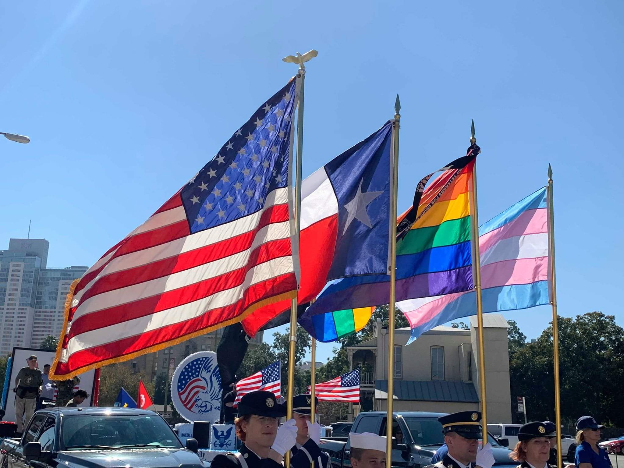 Fucking pathetic they fly the LGBT flags on the same level as the TX and USA flags. It is one thing if they are flying behind the real flags but they fucking have them as equal with the two real flags.