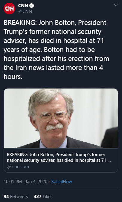 41 John Bolton dies at 71 (files.catbox.moe) 💩 SHITPOST 💩 posted 1 year ago by SneakyWino 1 year ago by SneakyWino +41 / -0 8 comments share 8 comments share save hide report block hide child comments Comments (8) sorted by: top new old worst ▲ 9 ▼ – EpicTrump 9 points 1 year ago +9 / -0 Shitpost flair needed permalink save report block reply ▲ 4 ▼ – amicuscodex 4 points 1 year ago +5 / -1 Bahahaha! Poor John, what a way to go. permalink save report block reply ▲ 4 ▼ – PaigeAshley 4 points 1 year ago +5 / -1 Dude, please list this as a parody! ?I almost freaked out thinking the Clinton's got another victim. permalink save report block reply ▲ 3 ▼ – iIndianaJones 3 points 1 year ago +3 / -0 Exactly! permalink parent save report block reply ▲ 3 ▼ – deleted 3 points 1 year ago +3 / -0 ▲ 3 ▼ – selfstarter20 3 points 1 year ago +3 / -0 Something about it seemed like a shit post. permalink save report block reply ▲ 2 ▼ – TEXinLA 2 points 1 year ago +2 / -0 Yup... permalink save report block reply ▲ 2 ▼ – h4b1t 2 points 1 year ago +2 / -0 Lol permalink save report block reply