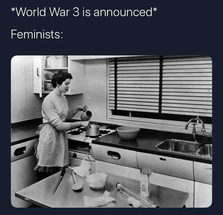 32 We need more memes here on .win (i.postimg.cc) posted 1 year ago by GuacamoleTariff 1 year ago by GuacamoleTariff +32 / -0 5 comments share 5 comments share save hide report block hide child comments Comments (5) sorted by: top new old worst ▲ 2 ▼ – KAGCountry 2 points 1 year ago +2 / -0 I don't get it? Can you explain how this image relates to WW3 and why a feminist is dressed like a traditional housewife? What is this meme trying to say? permalink save report block reply ▲ 1 ▼ – deleted 1 point 1 year ago +1 / -0 ▲ 2 ▼ – KAGCountry 2 points 1 year ago +2 / -0 There's nothing meek about being a traditional housewife. permalink parent save report block reply ▲ 1 ▼ – deleted 1 point 1 year ago +1 / -0 ▲ 1 ▼ – deleted 1 point 1 year ago +1 / -0