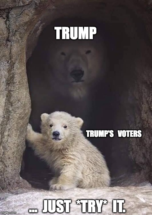 The grown up bear's face looks like The Donald. Besides, nobody's ever mistaken the Donald for a mere helpless cub.