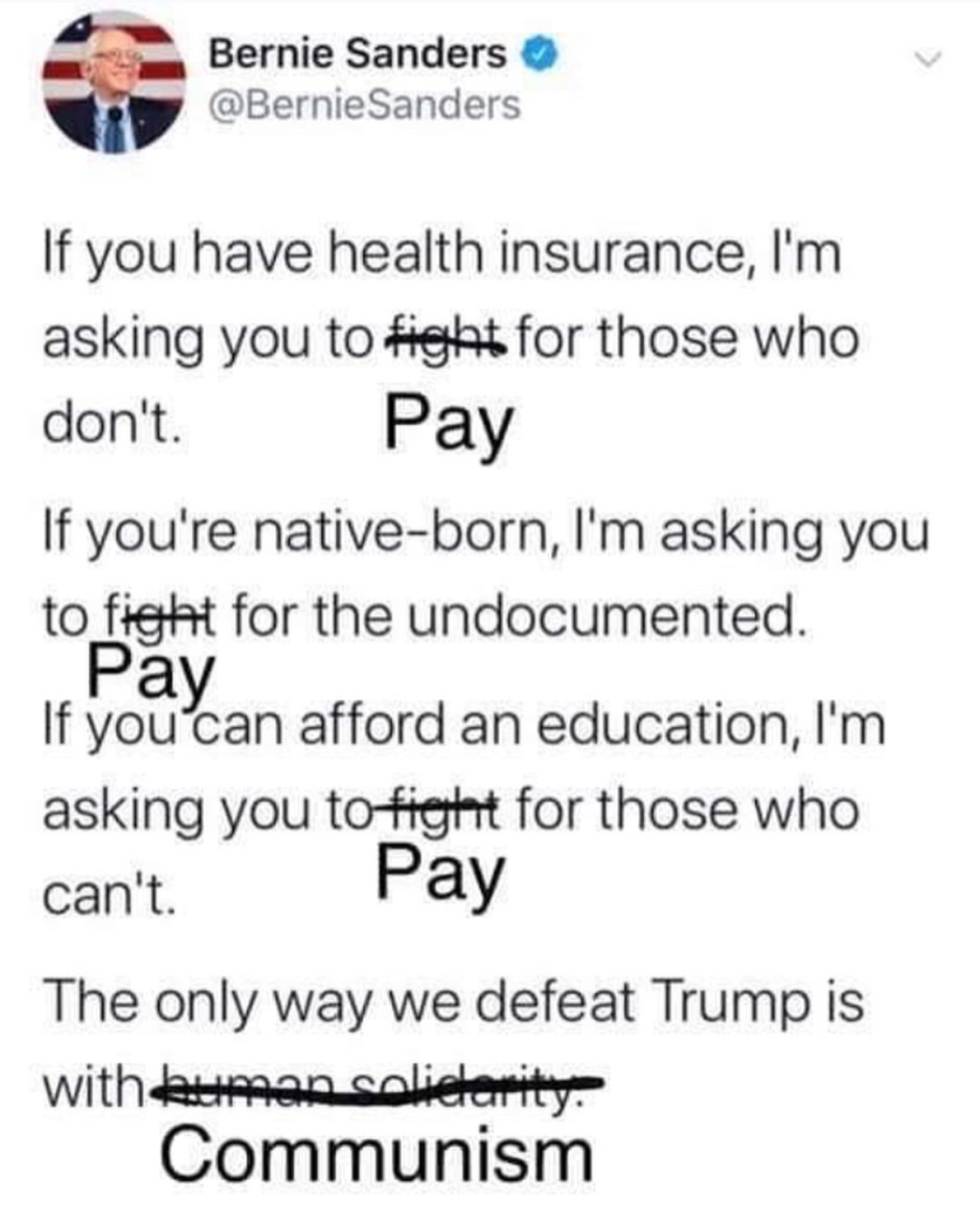 24 Bernie Sanders' Latest Tweet Translated from Commie to English (files.catbox.moe) posted 1 year ago by NewDonWhoDis 1 year ago by NewDonWhoDis +24 / -0 3 comments share 3 comments share save hide report block hide child comments Comments (3) sorted by: top new old worst You're viewing a single comment thread. View all comments, or full comment thread. ▲ 2 ▼ – IncredibleMrE1 2 points 1 year ago +2 / -0 Let me take your money or face the gulag, Nazi! permalink save report block reply