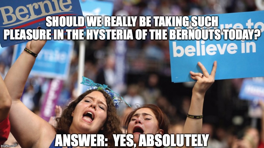 Berners show hysteria every single day. Might as well enjoy it while it's funny. Just keep pushing the "DNC is screwing Bernie" angle every chance you can...Trump has the right idea here. They are eating themselves.