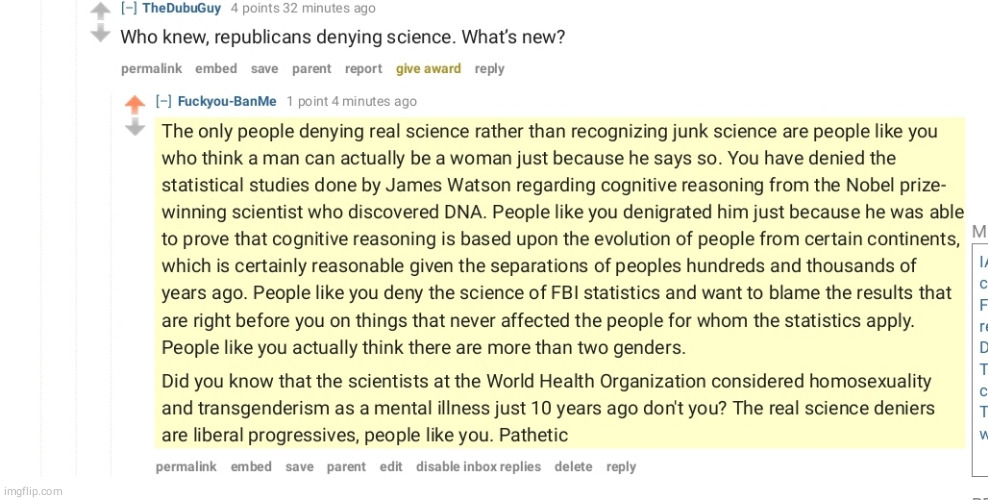 38 When they call you a science denier... (i.imgflip.com) posted 1 year ago by redditadminssuckit 1 year ago by redditadminssuckit +38 / -0 2 comments share 2 comments share save hide report block hide child comments Comments (2) sorted by: top new old worst ▲ 3 ▼ – deleted 3 points 1 year ago +3 / -0 ▲ 2 ▼ – EuropeanPatriot 2 points 1 year ago +2 / -0 Correct. I can see the salt in the reply afar from there, knowing how the reasoning of the average progressive resembles that of Cleverbot. permalink save report block reply