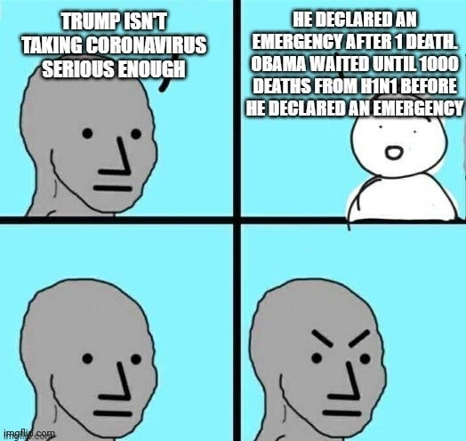 35 Same Day Different Bullshit (i.imgflip.com) posted 1 year ago by Mrpsy9 1 year ago by Mrpsy9 +35 / -0 2 comments share 2 comments share save hide report block hide child comments Comments (2) sorted by: top new old worst ▲ 1 ▼ – PoohClimbsTrees 1 point 1 year ago +1 / -0 When they tell you Obama acted in April. Ask them to show you where. https://obamawhitehouse.archives.gov/realitycheck/briefing-room/Presidential-Actions/2009/04 His October actions are listed here and include H1N1 response. https://obamawhitehouse.archives.gov/realitycheck/briefing-room/Presidential-Actions/2009/10 Obama did not act in April, HHS did. Obama did not act till October. permalink save report block reply ▲ 2 ▼ – deleted 2 points 1 year ago +2 / -0