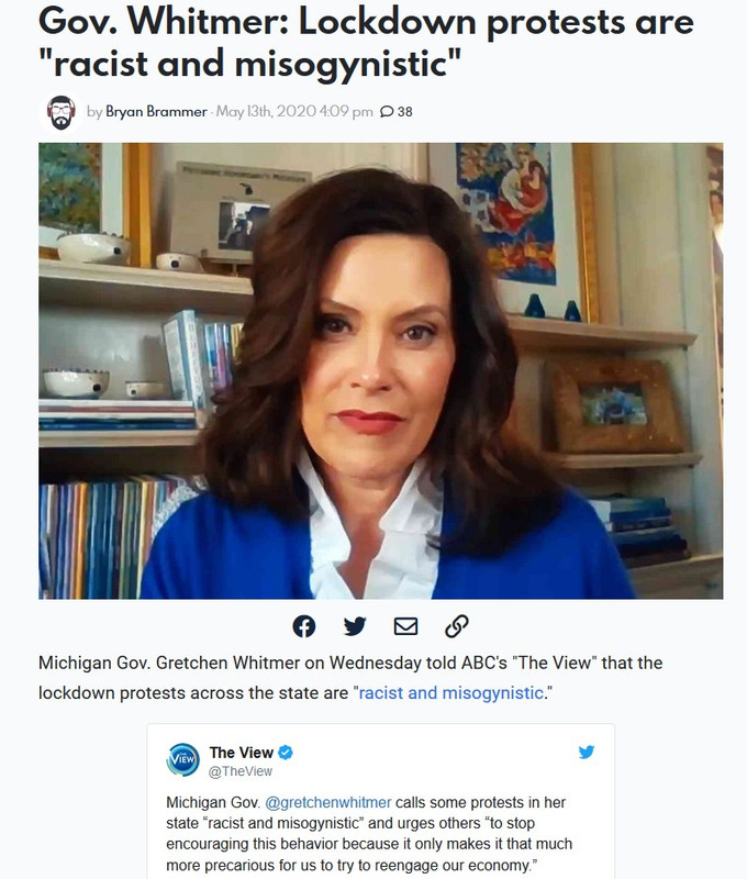 781 Gov. Whitmer: Lockdown protests are "racist and misogynistic" (i.postimg.cc) posted 338 days ago by RU_joe_king 338 days ago by RU_joe_king +781 / -0 52 comments share 52 comments share save hide report block hide child comments Comments (52) sorted by: top new old worst You're viewing a single comment thread. View all comments, or full comment thread. ▲ 11 ▼ – Kyro5411 11 points 338 days ago +11 / -0 Alternative translation: "This is all made up bullshit that I am using to get money from Soros." permalink save report block reply