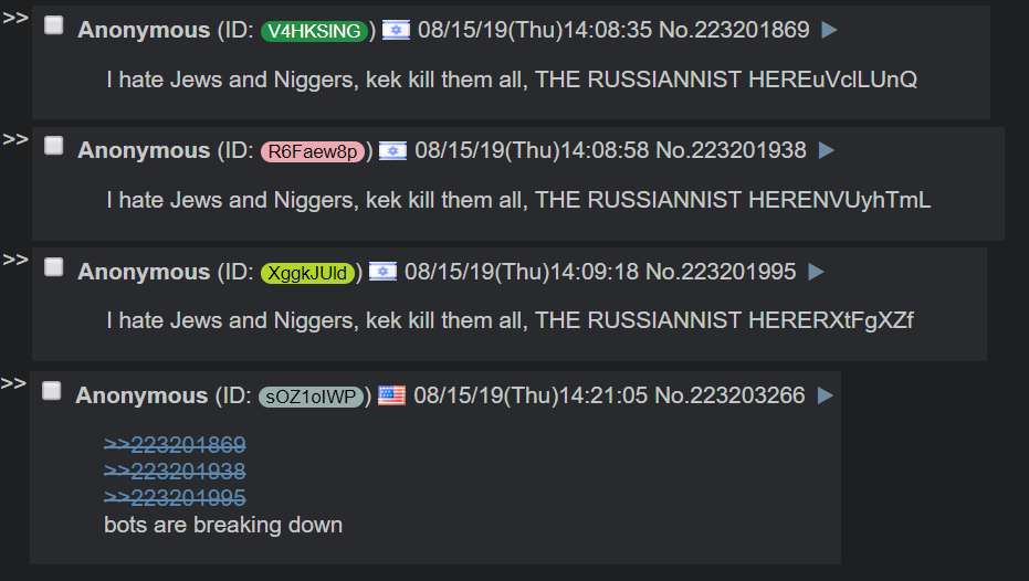 4Chan is also where all the information agencies of the world go to lie to eachother. It's kind of funny when you recognize the bots of different countries arguing with eachother, and make no mistake about it, there are bots on 4chan. They break pretty frequently too. Here, have some screenshots of times in which the bots broke.