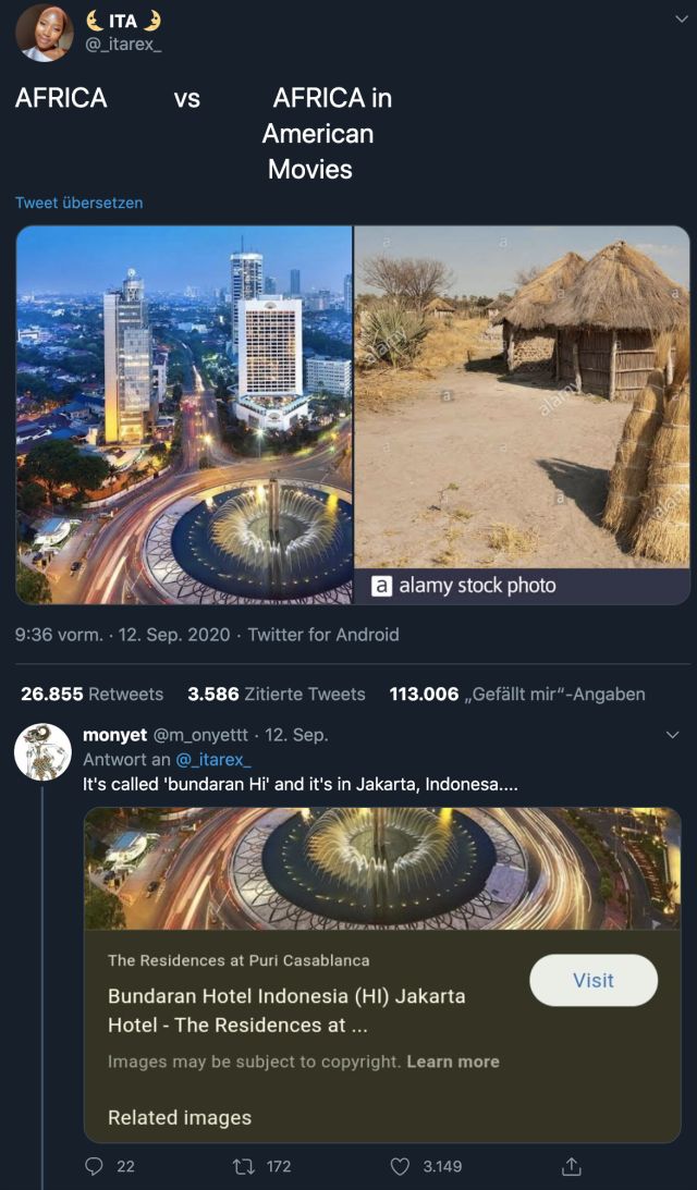 This does nothing but expose her own race-baiting bullshit about Africa. There are plenty of pockets of decent civilization there, she knows better and did not use them. Instead she picked an image search for ‘mud hut Africa’ because she is looking to incite anti American white drama and collect victim points.