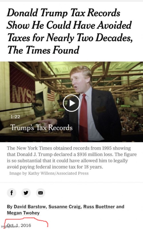 21 Drumpf is Finishd. NYT Got Him Good n Sheeeet.. It Was a Nice Ride Boys.. (dnyuz.com) posted 225 days ago by beta-detector 225 days ago by beta-detector +21 / -0 6 comments share 6 comments share save hide report block hide child comments Comments (6) sorted by: top new old worst ▲ 5 ▼ – Tomm 5 points 225 days ago +5 / -0 Except that they ran the same story four years ago this week. (Honk honk). https://i.imgflip.com/4ghumy.jpg permalink save report block reply ▲ 1 ▼ – beta-detector [S] 1 point 225 days ago +1 / -0 LOL! Thanks for the link! HONK, HONK Indeed. permalink parent save report block reply ▲ 2 ▼ – Tomm 2 points 225 days ago +2 / -0 https://www.nytimes.com/2016/10/02/us/politics/donald-trump-taxes.html Actual article if you’re interested. Direct link on purpose so they see that we are watching) permalink parent save report block reply ▲ 3 ▼ – deleted 3 points 225 days ago +3 / -0 ▲ 2 ▼ – Mayhem64 2 points 225 days ago +2 / -0 Tax "avoidance" isn't a crime unless a Trump does it and tax "evasion" isn't a crime so long as a Biden does it. Sounds fair, oh well pedes you knew the run wasn't going to last forever. permalink save report block reply ▲ 1 ▼ – beta-detector [S] 1 point 225 days ago +1 / -0 All Trump did with his taxes was (is) legal. They're trying to paint him like he's Al Capone. KEK! permalink save report block reply