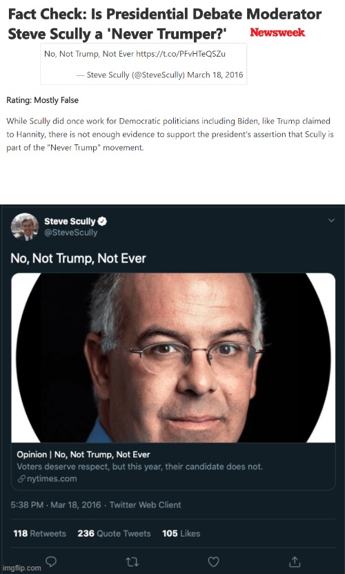 He said "no, not trump. Not ever." He never officially announced that he was a Never Trumper™. take that drumpftards! Owned.