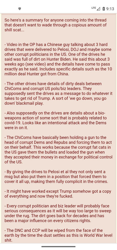 The last two paragraphs of extremism didn't help credibility. "This time the Dems AND the CCP are going down, together!!!" The DOJ is not going to lift a finger about this until its culture and career employees are gutted. The truth is this corruption has taken place for decades and decades and the agency workforces have been demoralized. Who exactly was someone supposed to contact mid Obama term if you're a DOJ employee and find wrongdoing by the leaders of govt? There was no one. So commit suicide by refusing to accept that, or just file it away like everything else, or quit and no one will no why anyway. People don't understand how infested our govt is, but also the banality of most of it.