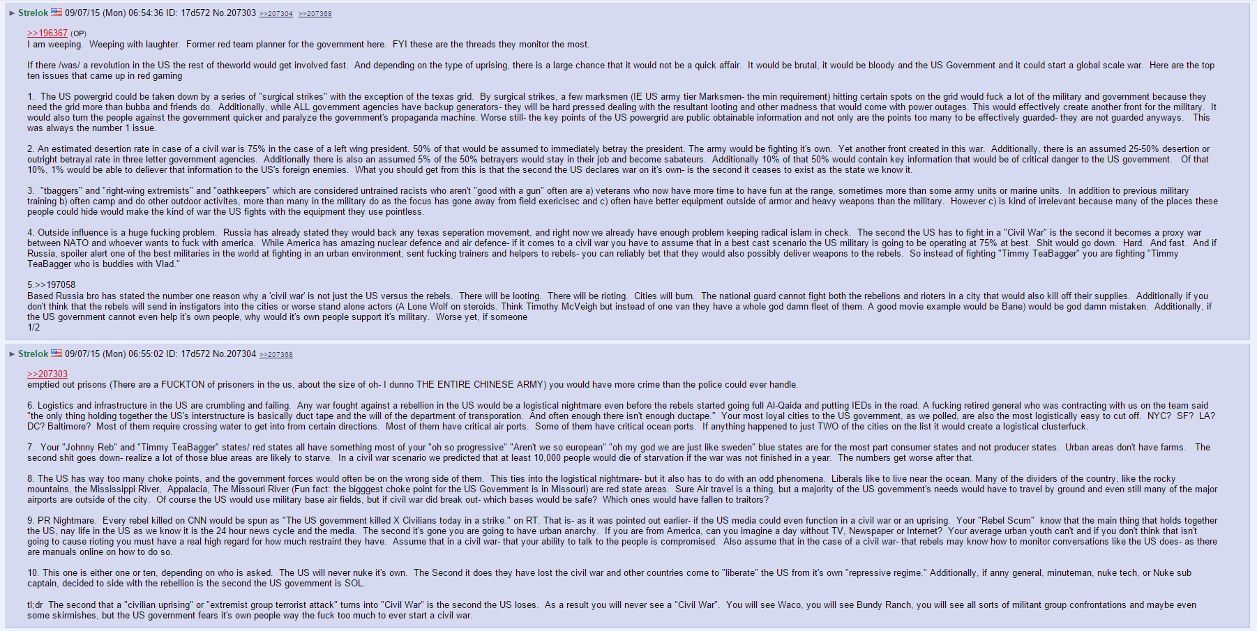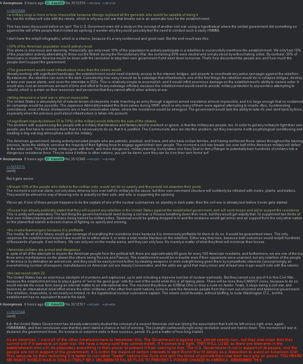 Civil war is a bad idea unless it's their only option. Then, they may take it. Even if they lose, it will hurt us badly. So if Trump actually positions himself to dismantle the deep state, then the deep state will position itself to start a civil war. It's basically the same logic as nuclear deterrence - mutually assured destruction. The chaos of a civil war also may allow the worst deep state actors to escape judgement and punishment.