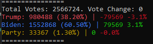 We now have a fractional vote that appears in the live data with Biden gaining more of the vote than Trump. If this was enough to cause the rounding to increase, we'd see an increase of 0.1% of the total vote to Trump and 0.1% decrease for Biden. That's why it looks like there's increases in a specific multiple (0.1% of total) when you take all the rounding errors and put them in a row.