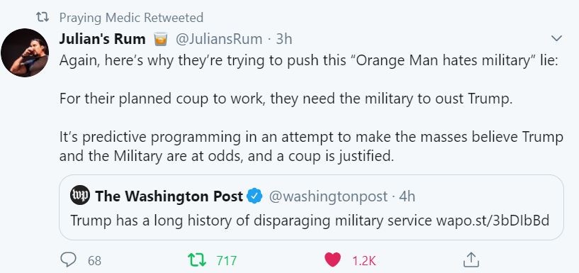 It's predictive programming in an attempt to make the masses believe Trump and the Military are at odds, and a coup is justified.