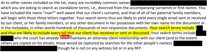 Basically, here is the lawyer arguing about the search terms being requested to provide as evidence. At this point, they are arguing certain NAMES on the list are too common, like max. Then they state "Your search terms include [REDACTED] and thus are likely to include every **bill ** that our client has received or sent or discussed." Well gee, I wonder who BILL could be...